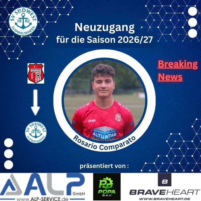 Mit Rosario Comparato wechselt ein erst 19-jähriger, zweikampfstarker Mittelfeldspieler zum SV Südwest. Der junge Italiener steht derzeit noch bei Türkspor Mannheim unter Vertrag und hat sich dort in der 1. Mannschaft einen Stammplatz erarbeitet. In der Landesliga Rhein-Neckar kommt er trotz seines jungen Alters regelmäßig zum Einsatz und überzeugt mit Einsatzwillen, Laufstärke und Zweikampfstärke.