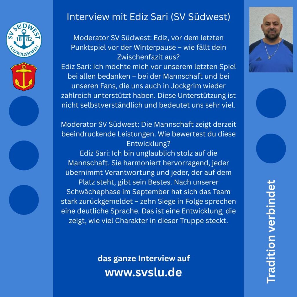 Interview mit Ediz Sari (SV Südwest) Moderator SV Südwest: Ediz, vor dem letzten Punktspiel vor der Winterpause – wie fällt dein Zwischenfazit aus?Ediz Sari: Ich möchte mich vor unserem letzten Spiel bei allen bedanken – bei der Mannschaft und bei unseren Fans, die uns auch in Jockgrim wieder zahlreich unterstützt haben. Diese Unterstützung ist nicht […]