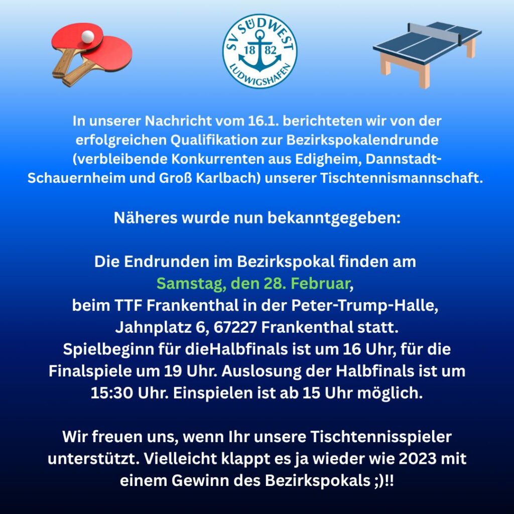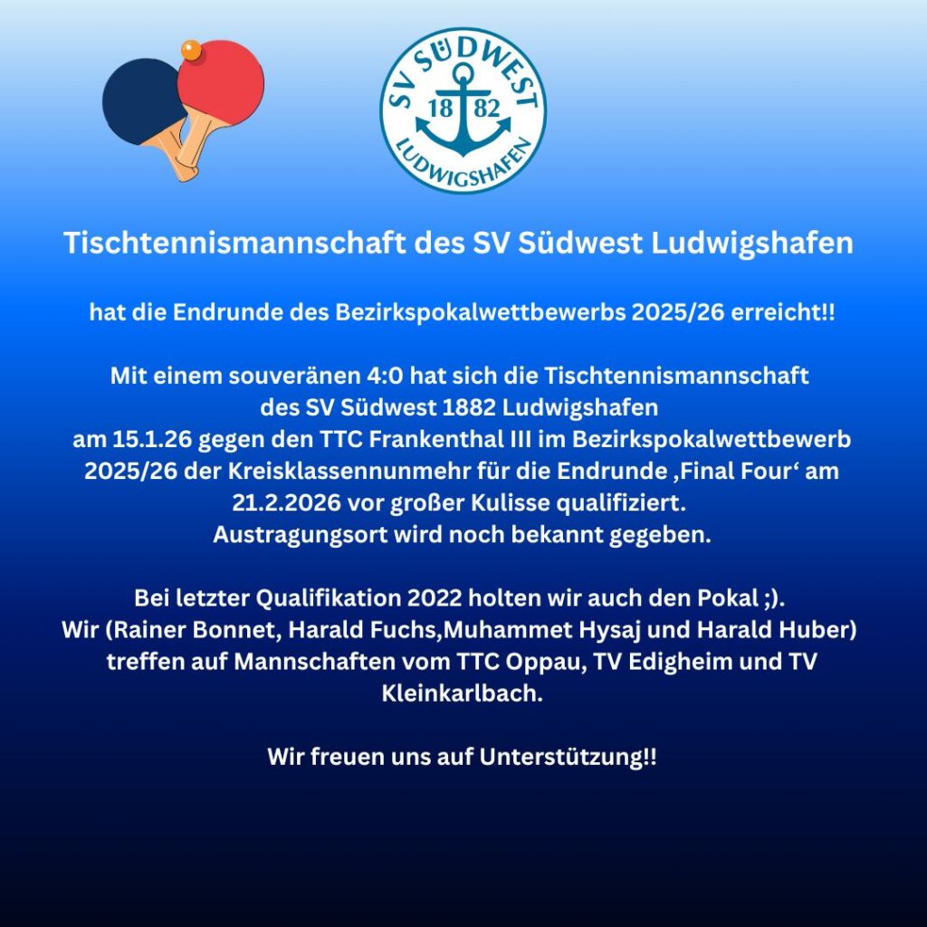 Tischtennismannschaft des SV Südwest Ludwigshafen hat die Endrunde desBezirkspokalwettbewerbs 2025/26 erreicht!! Mit einem souveränen 4:0 hat sich die Tischtennismannschaft des SV Südwest Ludwigshafen am15.1.26 gegen den TTC Frankenthal III im Bezirkspokalwettbewerb 2025/26 der Kreisklassennunmehr für die Endrunde ‚Final Four‘ am 21.2.2026 vor großer Kulisse qualifiziert. Austragungsortwird noch bekannt gegeben. Bei letzter Qualifikation 2022 holten wir […]